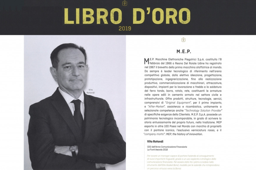 Innovation, Finance and Legal World were the protagonists of "Le Fonti Day & Night" which took place on November the 22nd in the prestigious setting of Palazzo Mezzanotte, home of Borsa Italiana. A day dedicated to the world of business and technological innovation, which ended in the evening with the "Le Fonti Innovation & Leadership Awards" focused on Finance, IT and the Business Compliance.Among the winners, Mr Vito Rotondi CEO & Managing Director of M.E.P.Macchine Elettroniche Piegatrici SpA in the "CEO of the Year for Financial Communication" category.